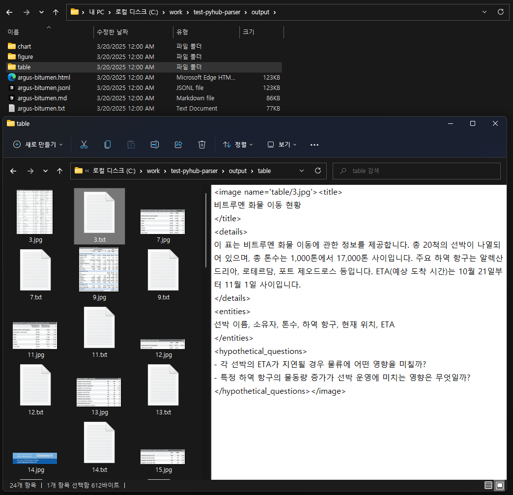 pyhub.parser upstage명령 1번 만으로 PDF 문서 (샘플: argus-bitumen.pdf)를 파싱하여 Vector Store에 즉시 반영할 수 있는 형태로 파일들을 생성하실 수 있습니다. - 이미지/표를 이미지로 추출가능하며,